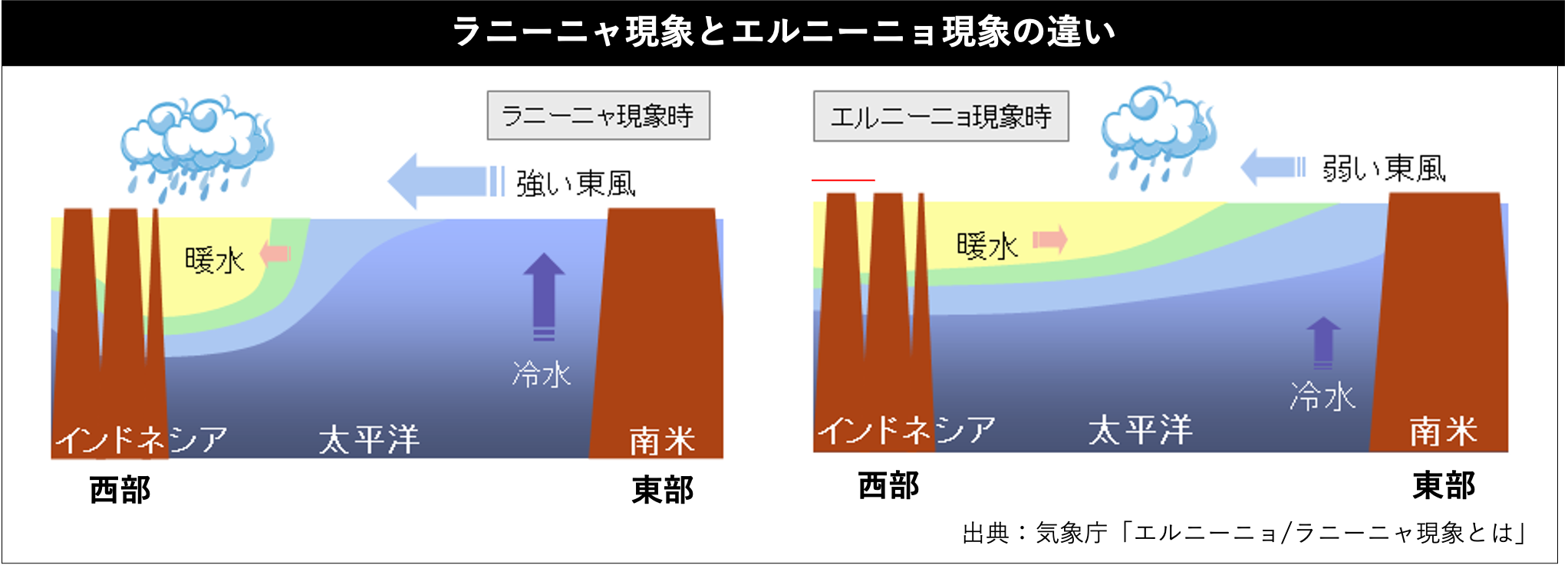ラニーニャ現象とは、太平洋赤道域の海面温度が例年に比べて、西部でより高く、東部でより低くなる現象です。赤道域で常に吹いている貿易風と呼ばれる東風が、例年に比べて強まることによって発生します。