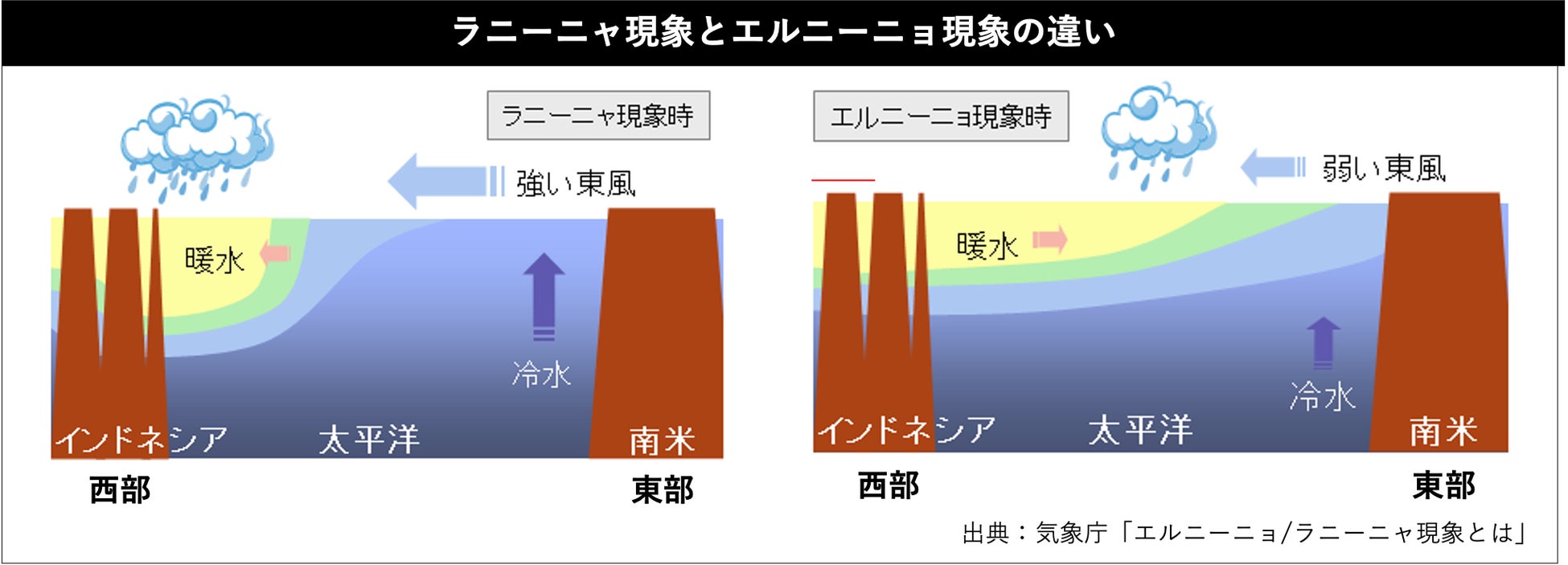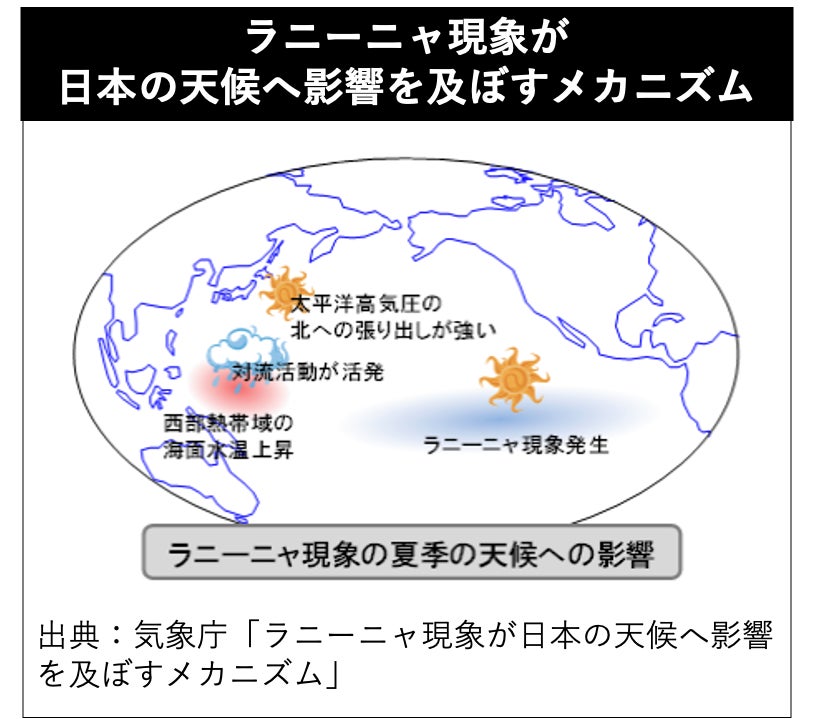 ラニーニャ現象が発生すると、インドネシアの海域で積乱雲の発生が一段と活発になり、その反動で周辺では下降流が強くなって、太平洋高気圧が強化されるという仕組みです。太平洋高気圧の勢力が強ければ強いほど、気温も高くなって猛暑となります。