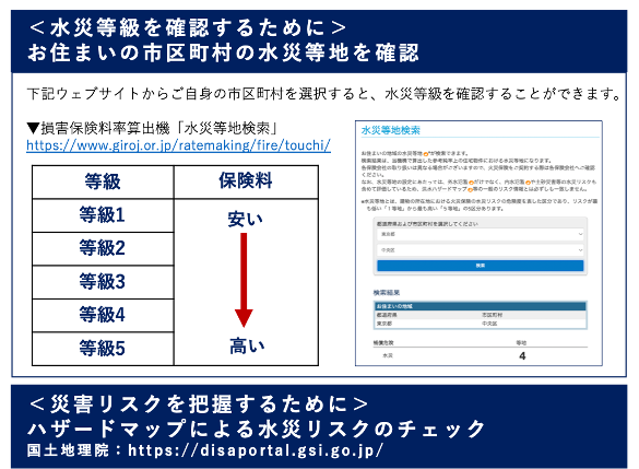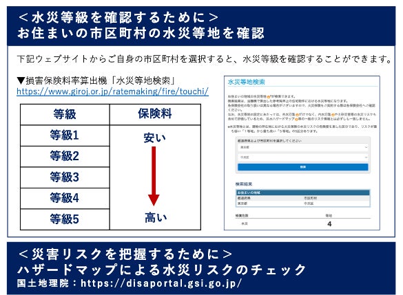 料率改定に先立って、損害保険料率算出機構のウェブサイト上で、お住まいの市区町村がどの水災等地に分類されるかを検索することができます。居住エリアの水災リスクを把握し、補償内容の見直しの参考にしてみてはいかがでしょうか。なお、水災等地の区分は永続的なものではなく、今後の自然災害の状況等に合わせて適宜見直しが行われる予定です。