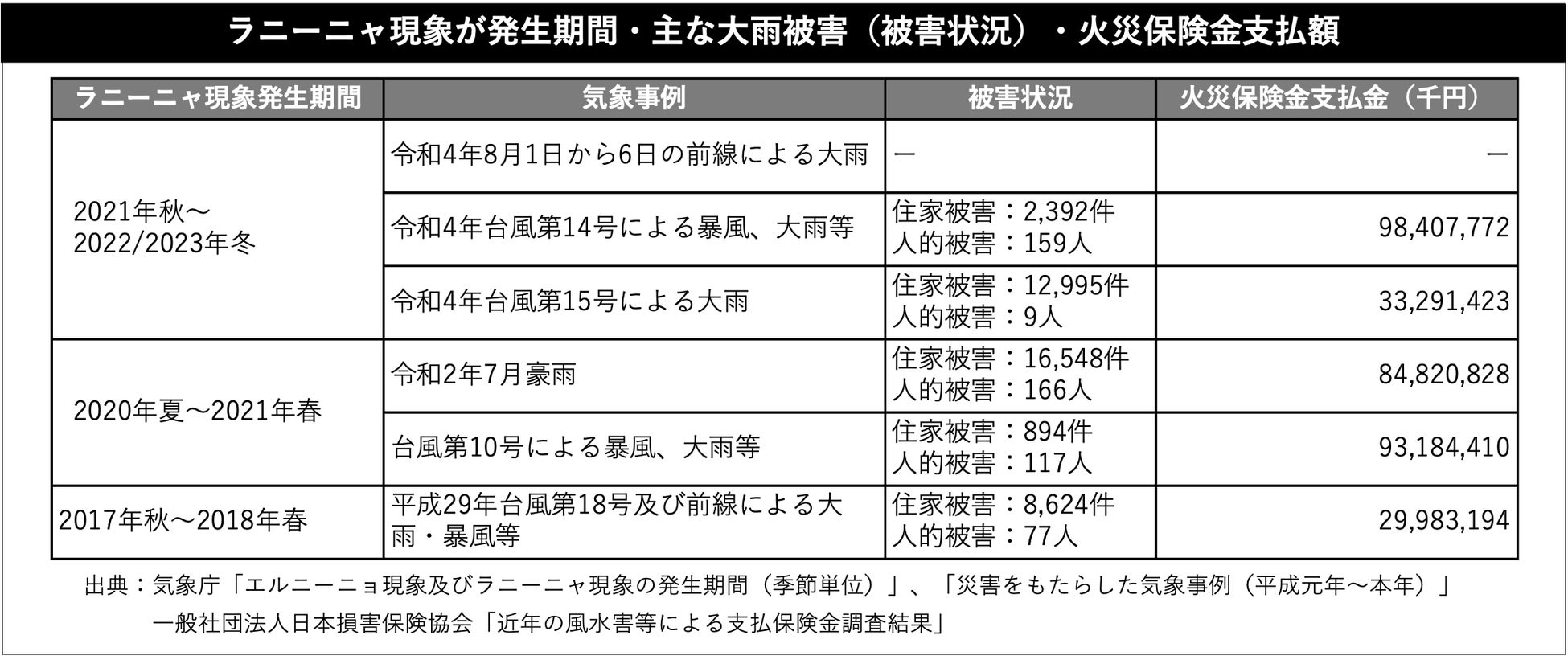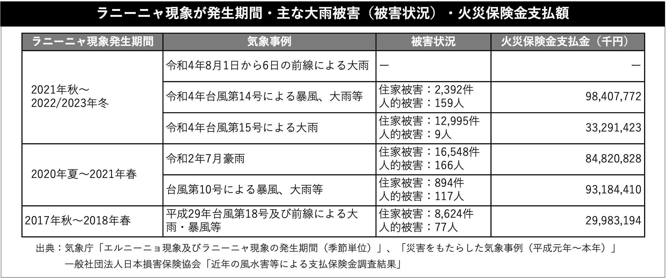 ラニーニャ現象が発生した年にはどのような大雨被害が発生しているのか。下表は2017年~2023年の期間に発生したラニーニャ現象と主な大雨被害をまとめています。