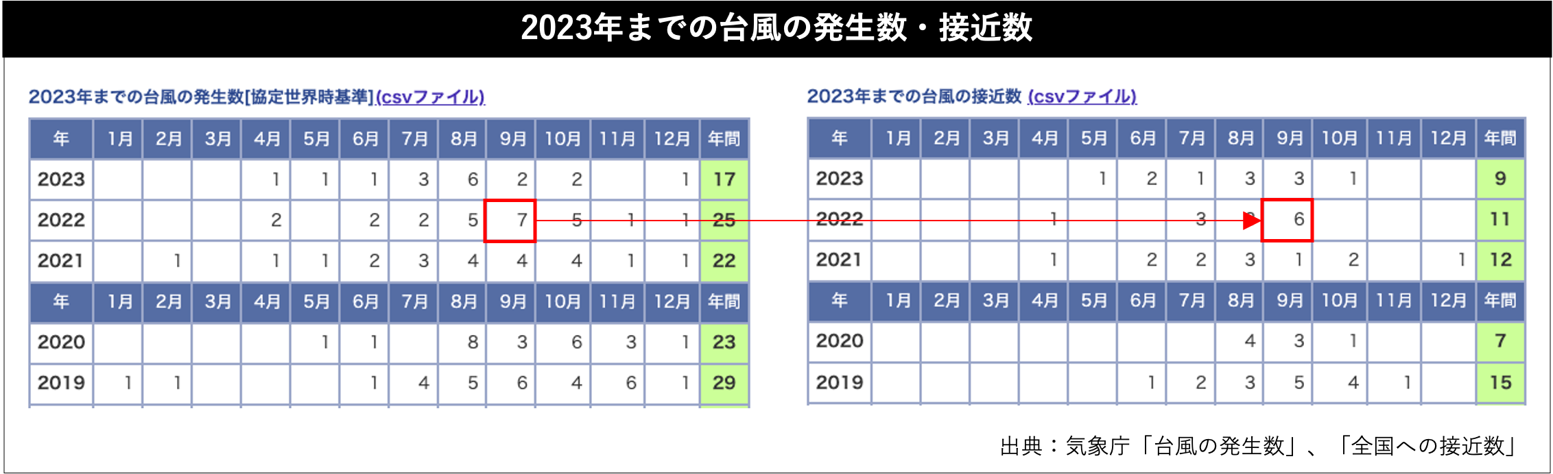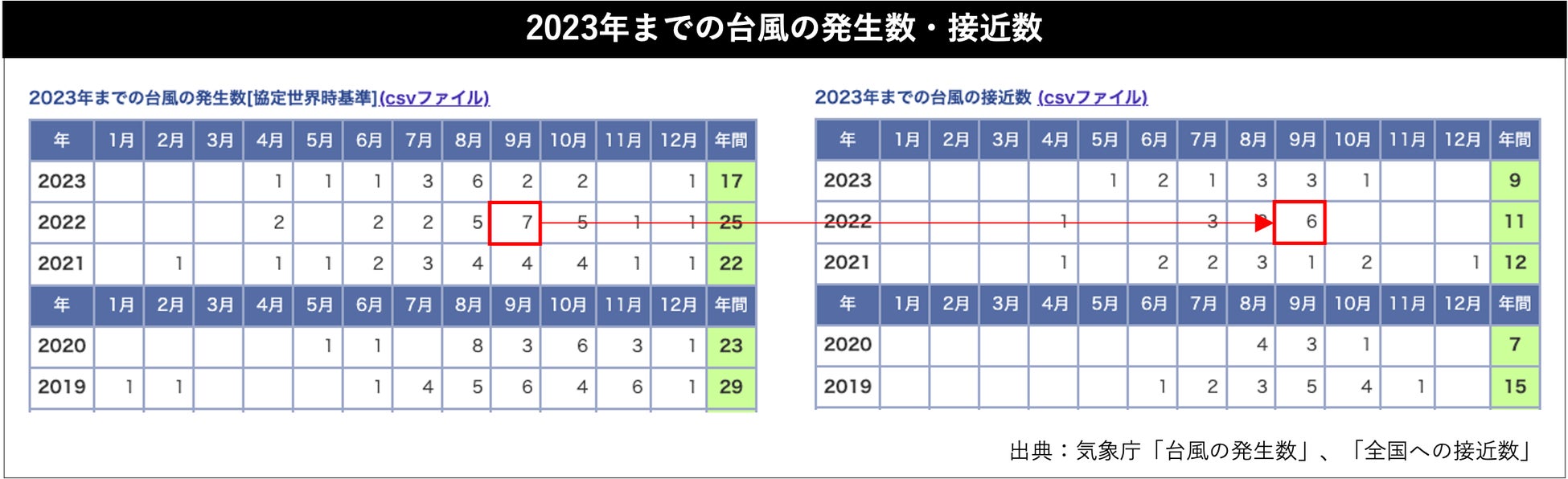 ちなみに2022年(令和4年)は9月に台風14号と台風15号が立て続けに接近し、大きな被害をもたらしています。以下の表からも、2022年の9月は台風発生数が7個であるのに対して、台風接近数は6個で、発生した台風が高い確率で日本に接近しているのがわかります。台風の進路は風や気圧配置の影響も大きく受けますが、ラニーニャ現象によって日本に近い場所で台風が多く発生したことも、接近数が多くなった理由といえるでしょう。