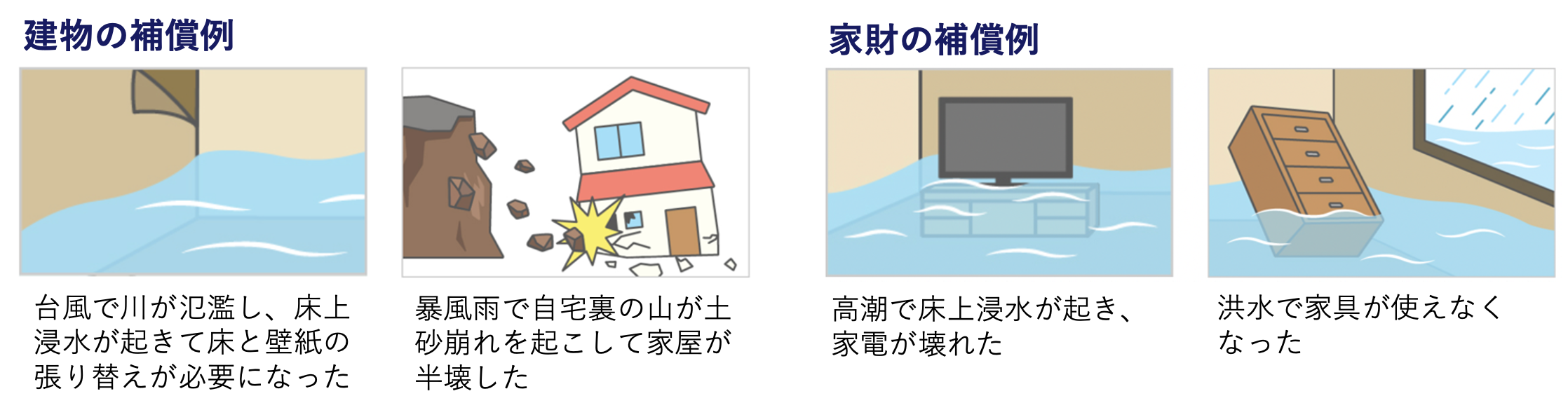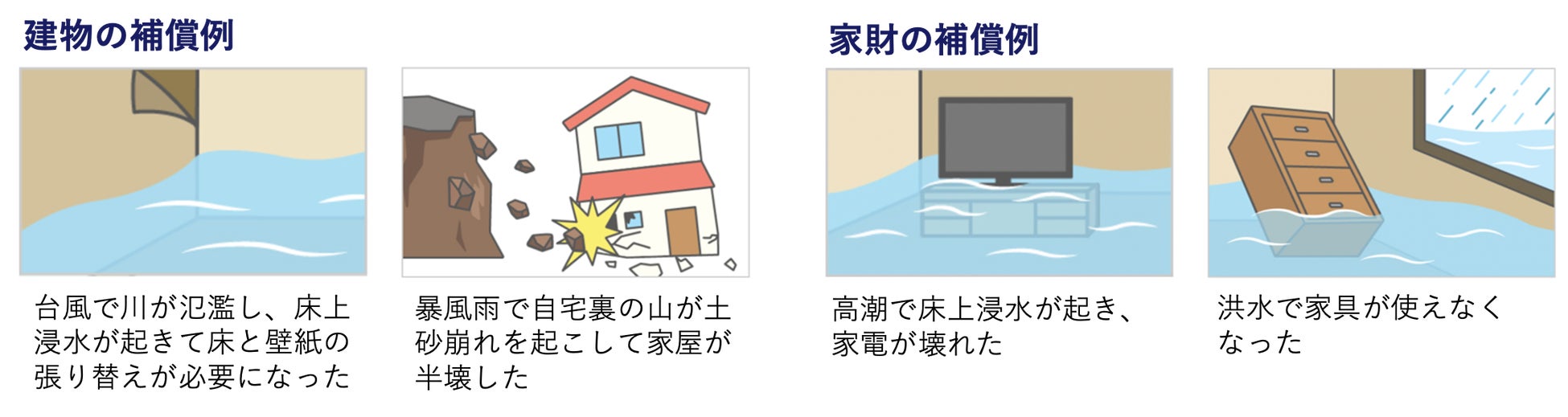 また火災保険では、補償対象を建物・家財の単位で選択します。水災の場合でも、範囲をどのように選択しているかによって被害に遭った際に補償される対象が異なってきます。