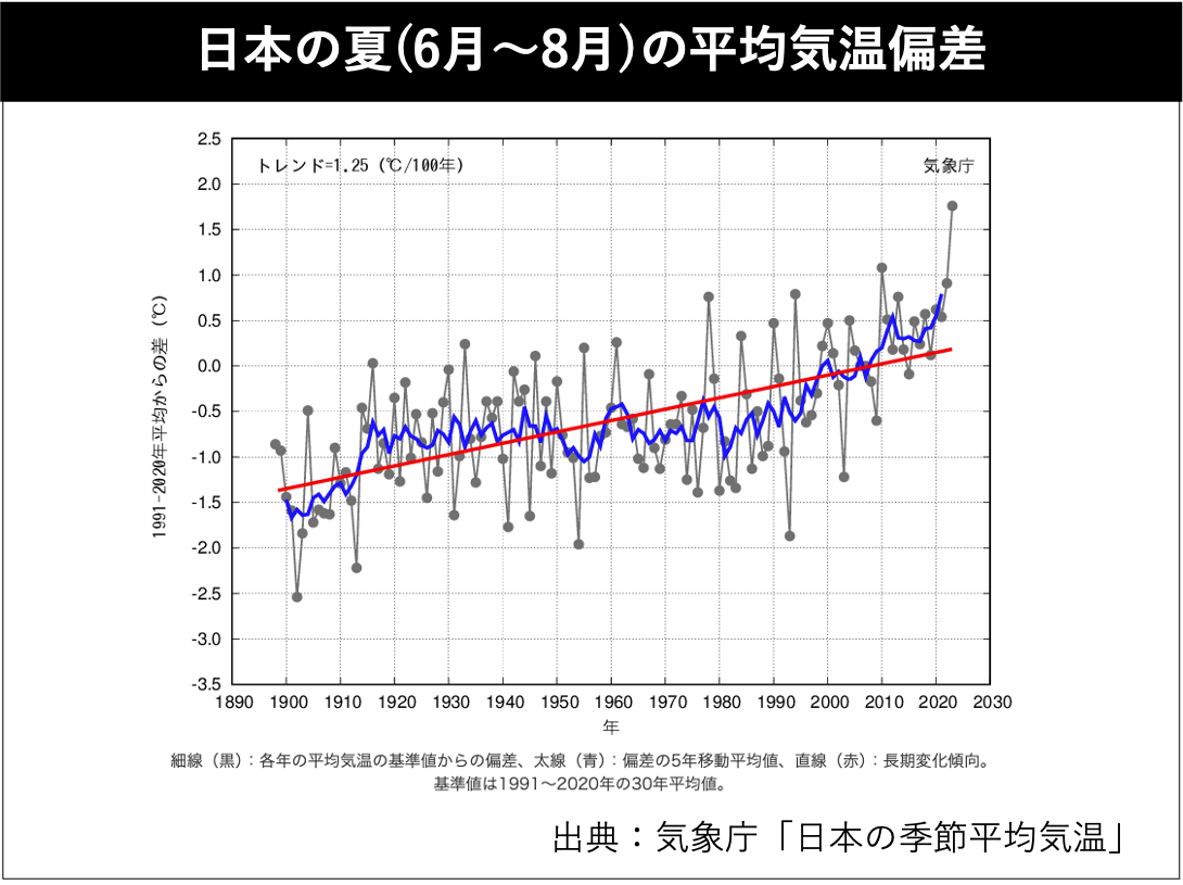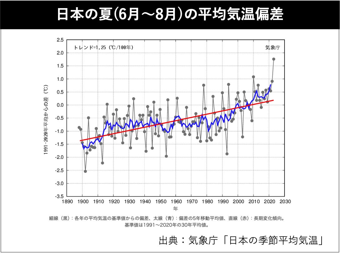 近年は地球温暖化の影響で気温の上昇が続いており、さらに今年の夏はラニーニャ現象の発生が予想されているため、記録的な暑さになる可能性があります。右の図は日本の夏(6月〜8月)の平均気温偏差です。