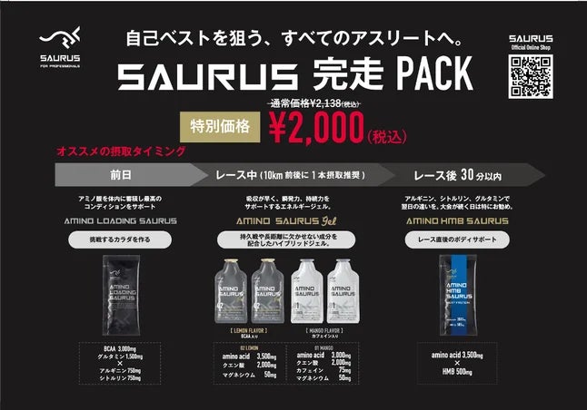 初心者からエリート一般ランナーまで、SAURUSが厳選したアミノ酸で全ランナーの身体をレース前日からレース後までトータルケア、走り抜く力を支える補給食セットを税込2,000円の特別価格にて限定発売!