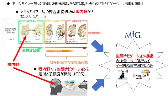 MIGは認知症を大きな社会問題と捉え40代・50代から始まるといわれる認知症の、「超早期 (アルツハイマー病最初期段階) 」での発見と対策に取り組んでいます。 2019年からキリンホールディングス株式会社と連携、また経済産業省の助成金により臨床試験とサービス開発を実施し、技術基盤を確立。2020年4月に、MIGのVRテストを使用してアルツハイマー病の超早期判定アプローチを確立するAMEDプロジェクト「最初期アルツハイマー病を検出する脳ナビゲーションタスクの神経回路基盤解明に関する研究開発」 (主研究者:藤田医科大学脳神経内科渡辺宏久教授、名古屋大学医学部、放射線医学総合研究所などとMIGが参加) が採択され今回第一号の論文発表が実施されました。