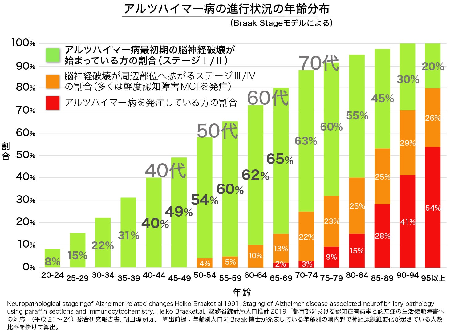 驚くことにアルツハイマー病の「最初期」段階である嗅内野での脳神経細胞の破壊が始まっている方 (Braak Stage I) は40代でも約50%近くいます。しかし自覚症状が全くない上に、既存の検査方法では「健常者」と判定されるために、知らない内にそのまま進行しているのが現状です。発症リスク低減活動 (予防活動) も最初期から始めると高い効果が期待できることが世界中で実施された疫学的研究からも分かっています。 (画像3)