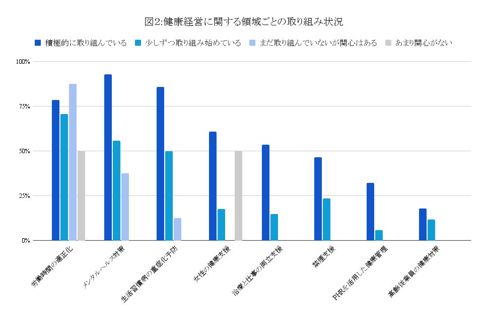 さらに、従業員の健康管理に関する具体的な施策として「メンタルヘルス対策」「生活習慣病の重症化予防」「労働時間の適正化」「女性の健康支援」「治療と仕事の両立支援」「禁煙支援」「PHRを活用した健康管理」「高齢従業員の健康対策」のテーマ別に実施状況を尋ねたところ、健康経営への取り組みレベルによって差があることが明らかになりました(図2参照)。