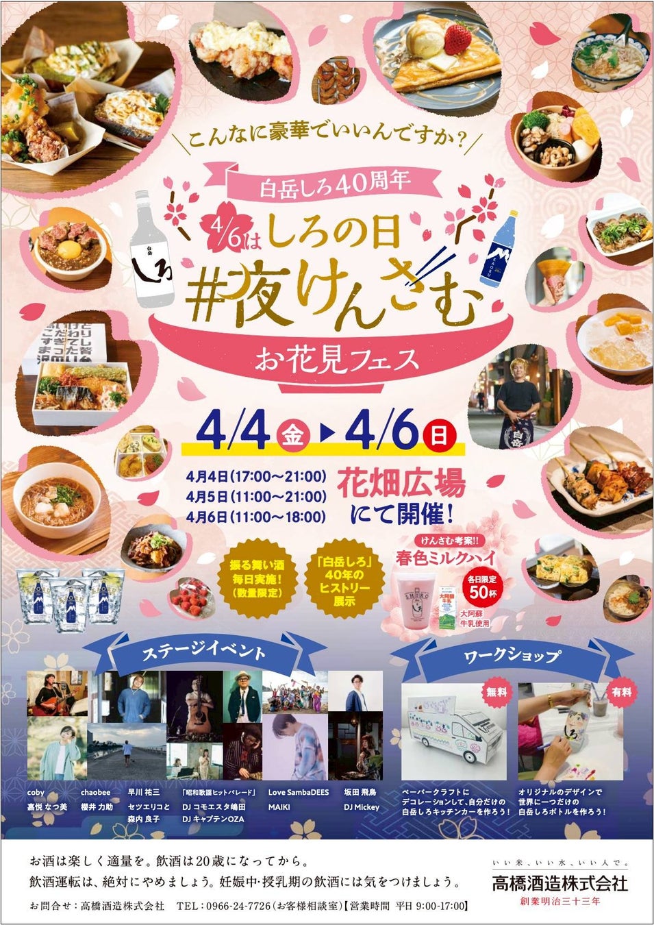 高橋酒造株式会社(本社:熊本県人吉市)は、主⼒ブランド「⽩岳しろ」の発売40周年を記念して、熊本の有名グルメブロガー“けんさむ”さんとコラボレーションしたグルメイベント「4/6はしろの日#夜けんさむ お花⾒フェス」を開催いたします。
