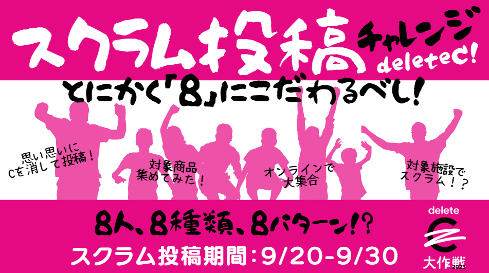 9/20(水)夜8時 「#deleteC大作戦」後半戦スタート!“8”にこだわる「スクラム投稿」チャレンジ企画を実施、応援を加速 https://www.delete-c.com/post