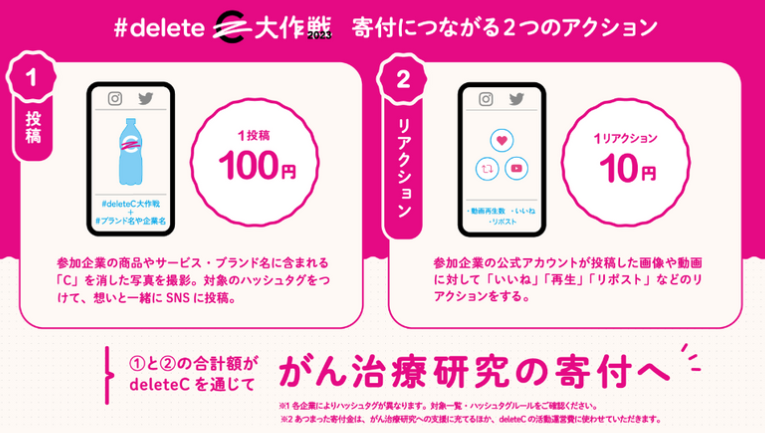 カタチで消した画像や動画を、「#deleteC大作戦」と「#参加企業・団体名、あるいはブランド名」(※2)をつけて参加者がSNS【X(Twitter)、Instagram】で投稿すると、1投稿あたり100円が、また、参加者が、参加企業・団体の公式アカウントが発信する画像や動画をシェア/いいね/再生をすると、1シェア/1いいね/1再生/あたり10円が、がん治療研究への寄付・啓発費用として、参加企業からdeleteCに届けられます。(※2)投稿の際のハッシュタグについては、deleteC特設サイト(https://www.delete-c.com/post)をご確認下さい。