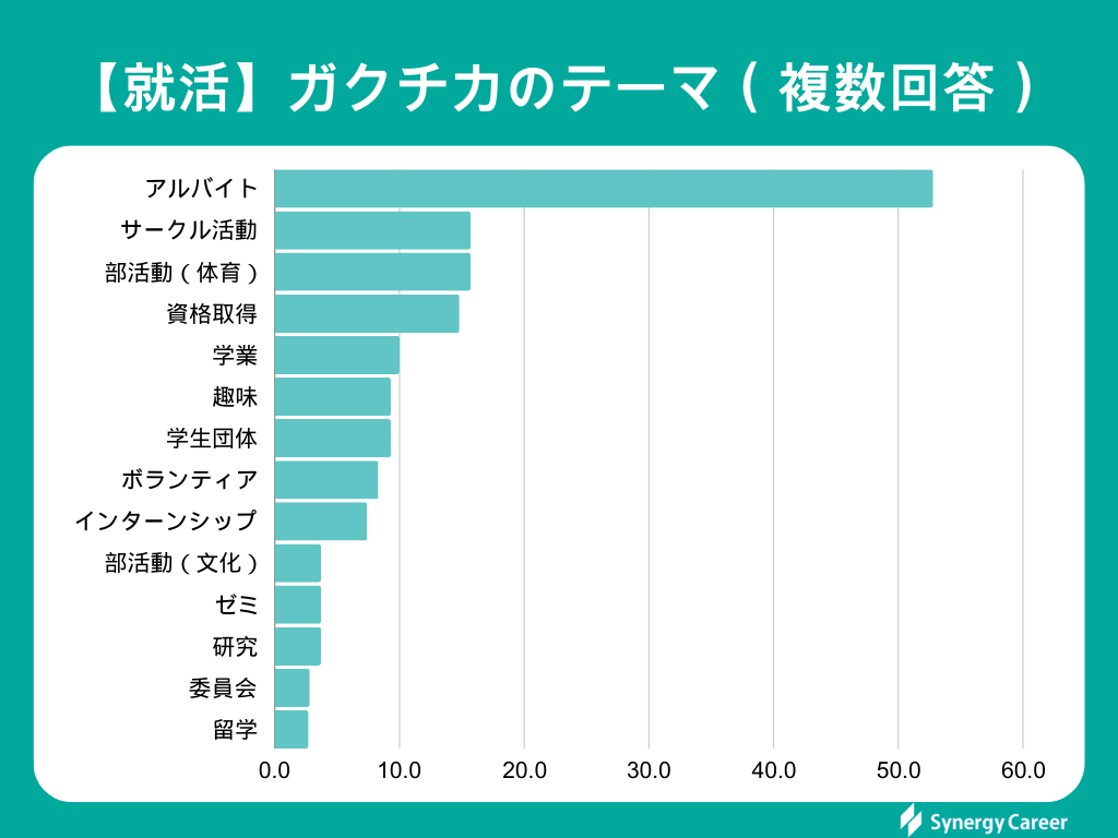 ガクチカで多いテーマは「アルバイト」(52.8%)で2人に1人が選んでいることが分かった。次いで多いのは「サークル活動」(15.7%)、「体育系の部活動」(15.7%)だったが、アルバイトと3〜4倍の差がついた。「インターンシップ」が増加する中、「インターン活動」のガクチカは7.4%と少ない