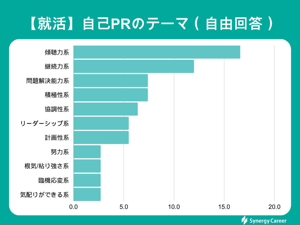 最も多かったのは「傾聴力」(16.6%)で、次いで「継続力」(12%)でした。どちらも「物事に取り組む姿勢」に関するという点で共通しており、このような特徴を持つ自己PRをアピールする傾向にあると思われます。また、これまで採用時に注目されていた「主体性」においては、「リーダーシップ系」(5.5%)と低く、アピールする学生が少ないと分かります。