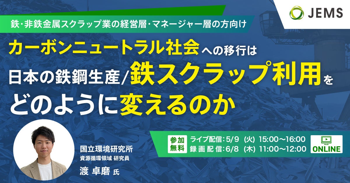 「ITで環境問題に挑む」をコーポレートスローガンに掲げる株式会社JEMS(本社:茨城県つくば市、代表取締役:須永裕毅)は、鉄・非鉄金属スクラップ業者様向けに、カーボンニュートラル社会において鉄スクラップ利用がどのように変わるのかを解説する無料のオンラインセミナーを開催します。ライブ配信5/9(火)、録画配信 6/8(木)のうち、どちらかご都合のよい日程でご参加ください。
