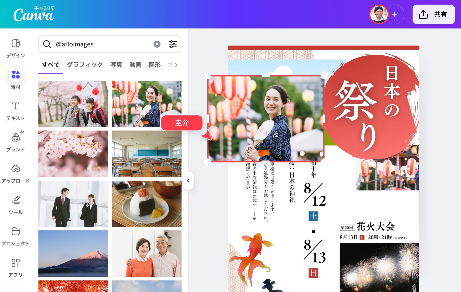世界随一のオールインワンビジュアルコミュニケーションプラットフォームを提供するCanvaの日本法人であるCanva Japanはこのたび、日本の大手ストックフォトプロバイダーであるアフロとの戦略的提携を発表し、日本のユーザーの皆さん向けに豊富なコレクションの提供を開始します。今回のコラボレーションでは、合計20万点以上の素材(約8万点の無料素材と、約12万点のプロ素材)が利用可能となり、今後も続々と新規素材を追加予定となっています。これによって日本のユーザーの皆さんのクリエイティブ体験が向上するとともに、高品質のビジュアルおよびローカルリソースへのアクセスが今までよりもさらに拡大されます。