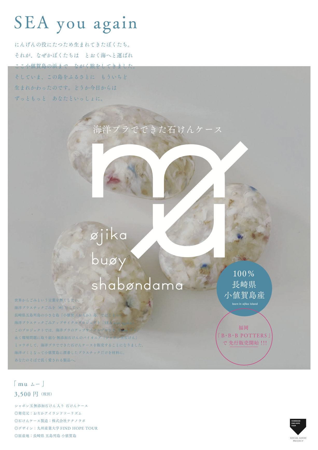 無添加石けんのパイオニアであるシャボン玉石けん株式会社(本社:福岡県北九州市/代表取締役社長 森田隼人)は、九州産業大学、五島列島の北部にある「小値賀島」、プラスチックメーカー「テクノラボ」とコラボレーションいたしました。「小値賀島の海洋ゴミのアップサイクルにより誕生した石けんケース」と「シャボン玉浴用」がセットになった「石けんケースmu(ムー)」を、2022年8月30日(火)より小値賀アイランドツーリズムおよびB・B・B POTTERS(スリービーポッターズ)店頭にて発売開始いたします。