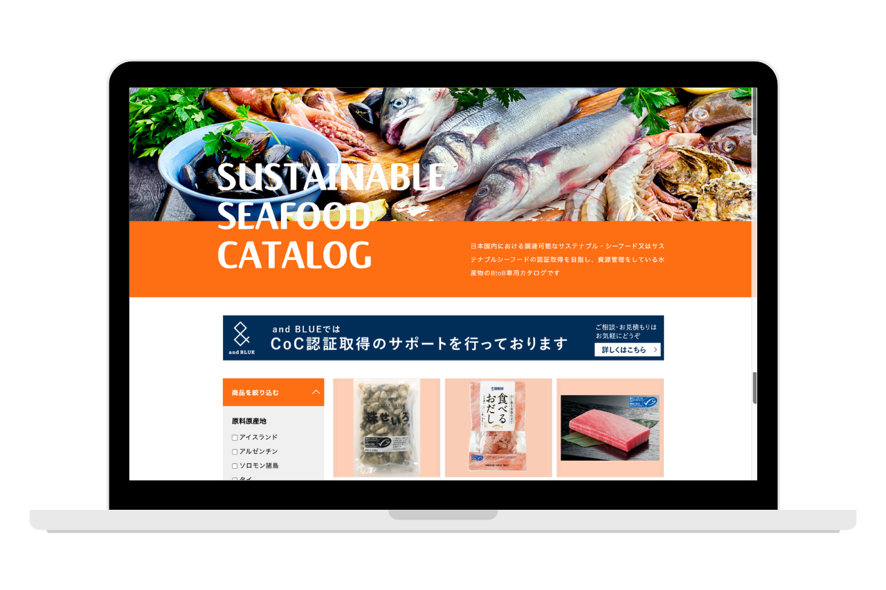 日本国内で調達可能なサステナブル・シーフード、またはMSC認証、ASC認証などの国際基準に合致する認証を取得できるレベルのサステナビリティを目指す漁業、養殖業による水産物のみを掲載。「サステナブル・シーフードは、取扱業者が少なくニーズに合った商品を見つけることが難しい」というマーケットの声を受け2021年12月にサイトオープン。SFLより導入サポートを行っています。