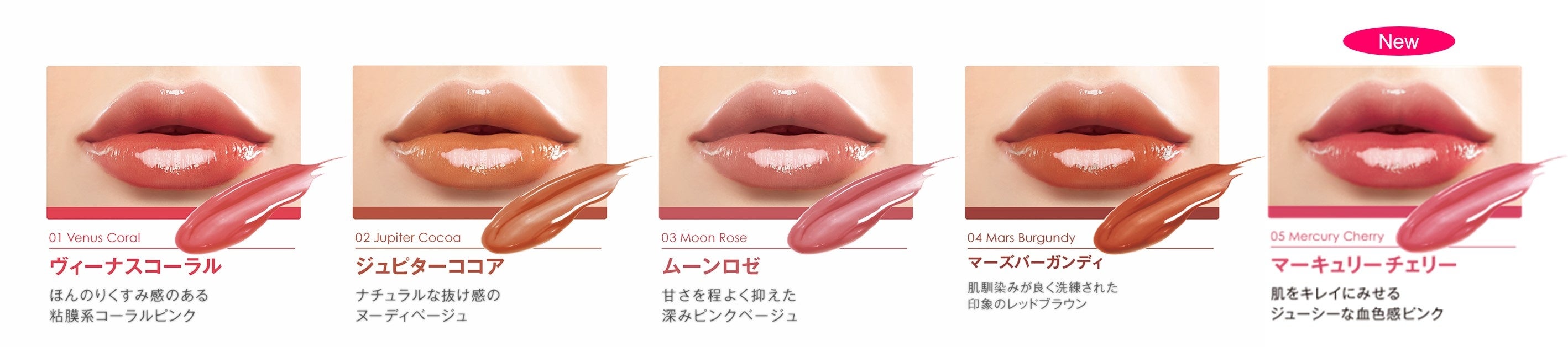 左から01 ヴィーナスコーラル、02 ジュピターココア、03 ムーンロゼ、 04 マーズバーガンディ 、 05 マーキュリーチェリー<新色>