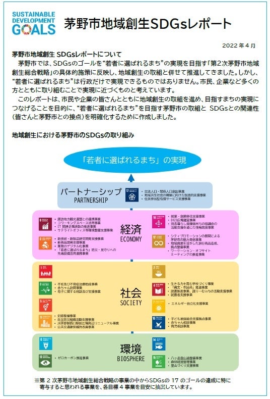 長野県茅野市(市長:今井 敦)では、地域創生のコンセプトである“若者に選ばれるまち”を企業や市民の皆さんとともに実現するため、「茅野市地域創生SDGsレポート」を作成しました。このレポートは、SDGsに関係する茅野市の事業をまとめ、茅野市の取り組みを多くの方に分かりやすく伝えるためのものです。