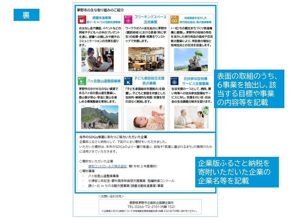 表面の取り組みのうち6事業を抽出し、該当する目標や事業の詳細等や企業版ふるさと納税を寄附いただいた企業の名称等を記載しています。