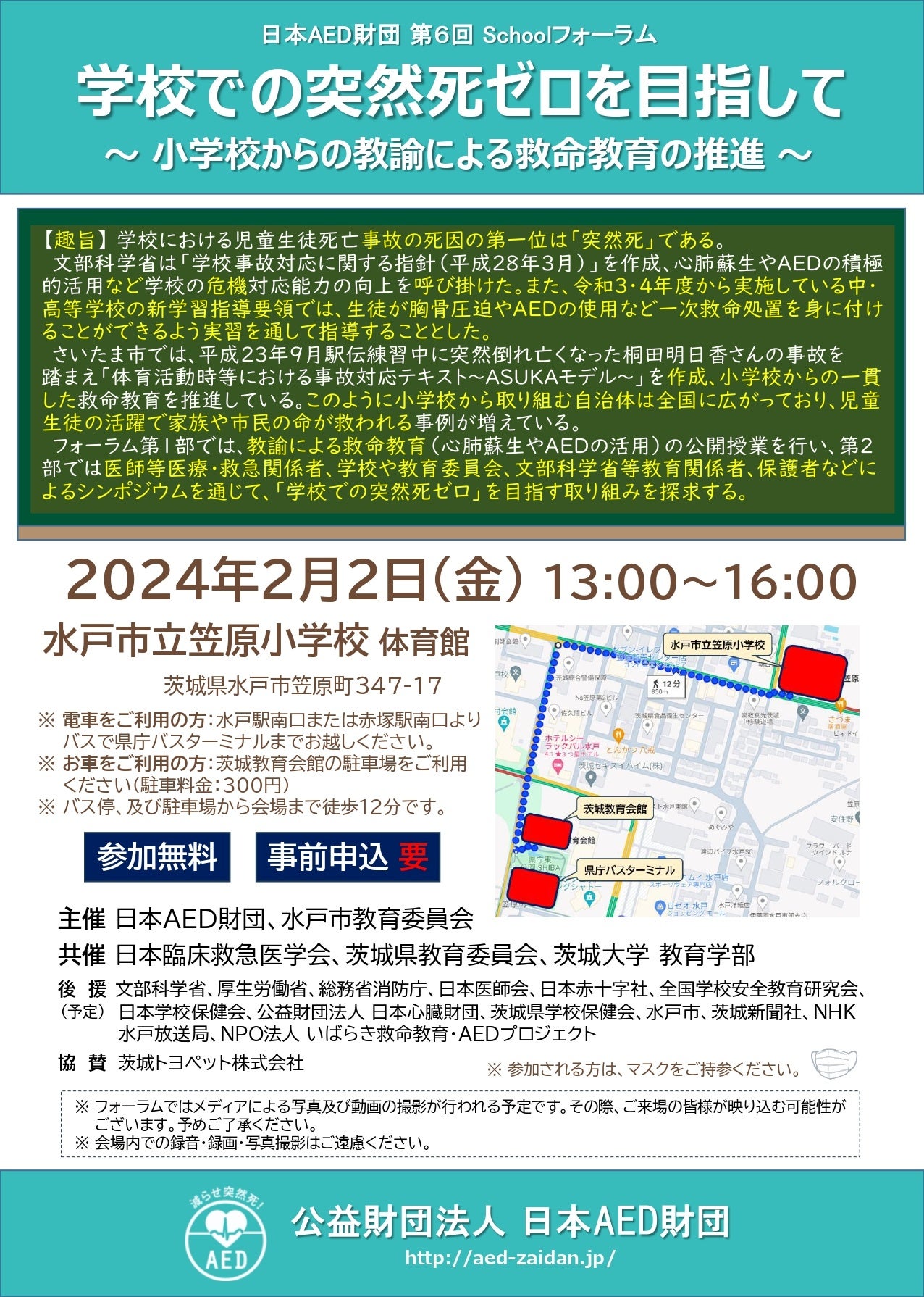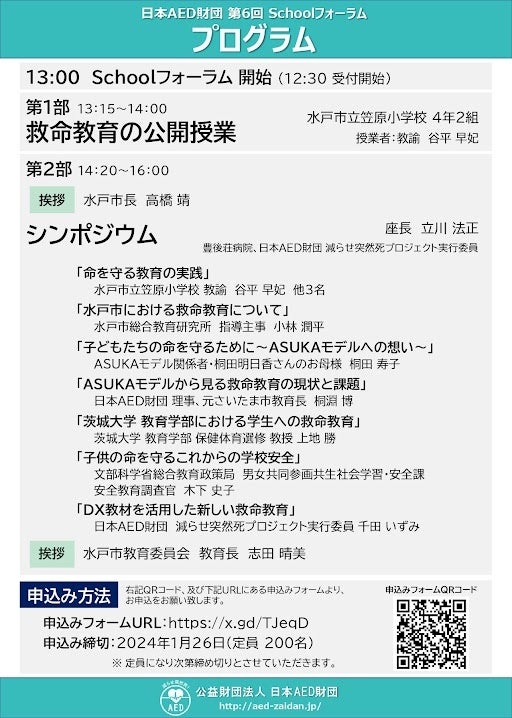 第6回 日本AED財団 Schoolフォーラム 学校での突然死ゼロを目指して~ 小学校からの教諭による救命教育の推進 ~を開催いたします