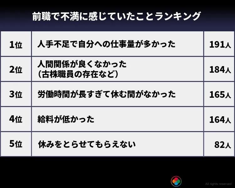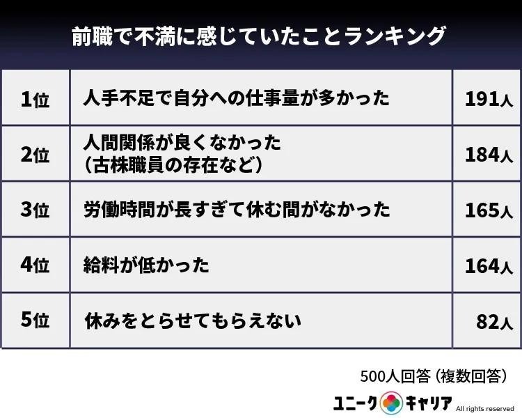 前職で不満に感じていたことを500人に訊いたところ、表のような結果となった。