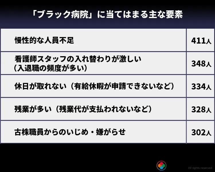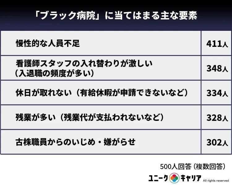 「ブラック病院」に当てはまる主な要素について質問したところ、表のような結果となった。