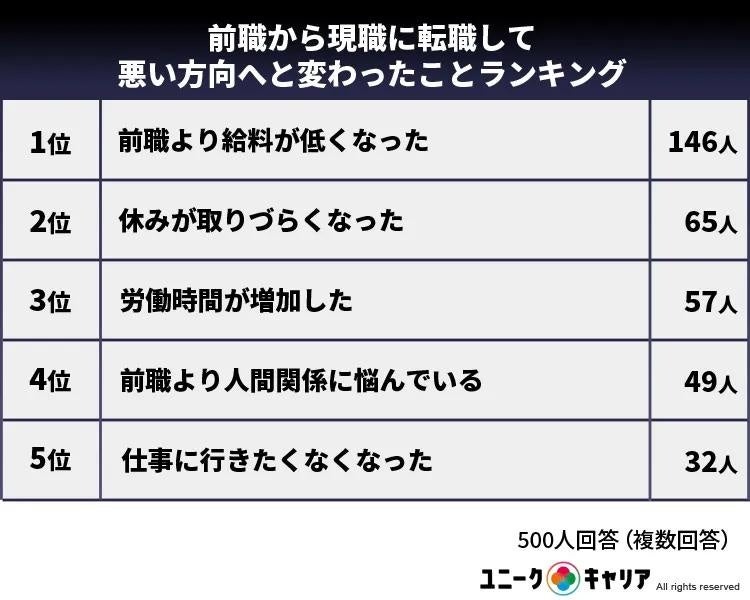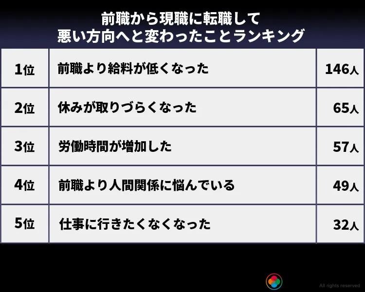 続いて、「前職から現職に転職して悪くなったこと」を訊いたところ、表のような結果が得られた。