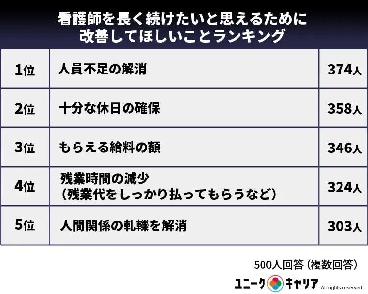 看護師を長く続けたいと思えるために改善してほしいことランキング