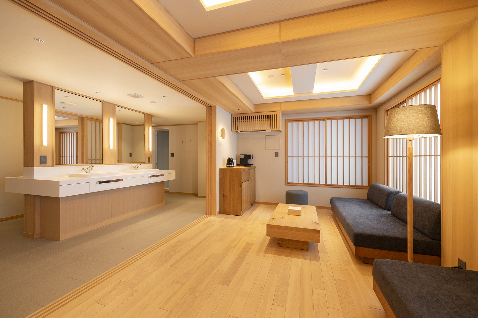堺町通に漂う季節ごとの香りや老舗の味わいが生む“香りの記憶”をデザインに昇華させたホテルです。浴室から枯山水の庭を望める客室や静けさに包まれる大浴場など、感覚の余白を愉しむ滞在が実現します。お部屋タイプはスタンダードツイン(約48.5㎡/1〜4名)とデラックスツイン(約89.6㎡/1〜6名)の2タイプ。