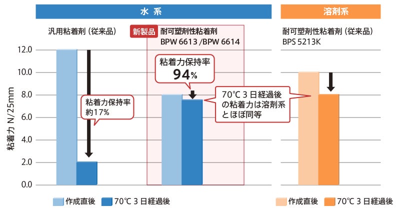 この度トーヨーケムが開発した「オリバイン® BPW 6613(高粘度タイプ)」「オリバイン® BPW 6614(粘度調整タイプ)」は水系の耐可塑剤性粘着剤です。従来の水系粘着剤とは異なる特殊な組成設計により、可塑剤が粘着剤に移行することを防ぐことで、粘着力低下の抑制に成功しました。本開発品は、70℃ 3日経時後の粘着力の保持率が94%と溶剤系と同等以上の性能を有し、かつ有機溶剤を含まずホルムアルデヒド放散量がF☆☆☆☆(フォースター)相当(*)であることを外部評価機関で確認しており、屋内用途でより安心してご使用いただけます。