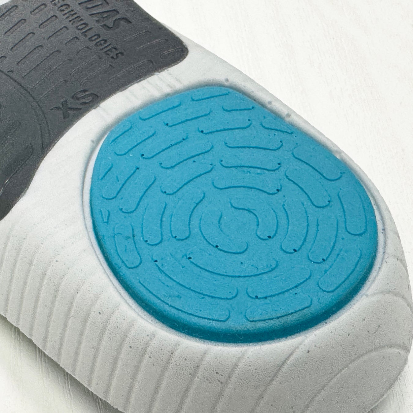 かかと部分には弾力性の高い独自のジェルパッドを内蔵。シューズ内部でかかとを包み込むヒールカップ形状と相まって、着地時の突き上げを緩和し、かかと周辺の筋肉・腱・骨を優しく保護します。