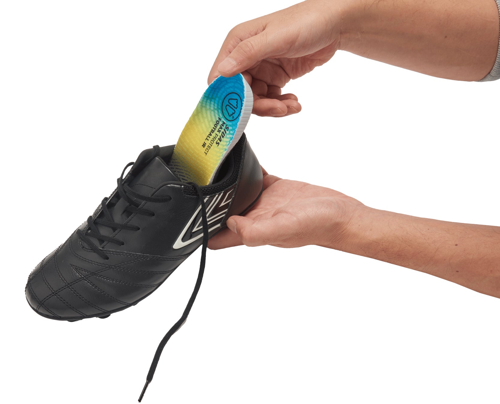 なお、特別なカスタム成形は不要で、市販のサッカースパイクやトレーニングシューズに入れるだけで使用可能です。靴のサイズに合わせてつま先部分をハサミでカット調整し、元のインソールと入れ替えるだけで装着完了。お子様でも扱いやすく、日々のシューズに手軽に取り入れることができます。