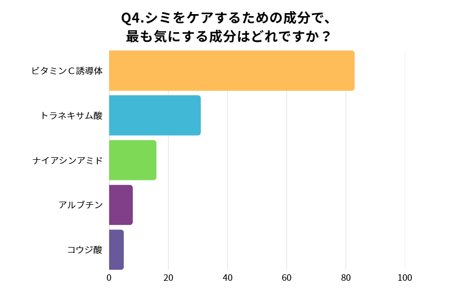 美白美容液に含まれている成分の中で、どの成分を気にして選ぶかを調査したところ、「ビタミンC誘導体」が1位と言う結果に。