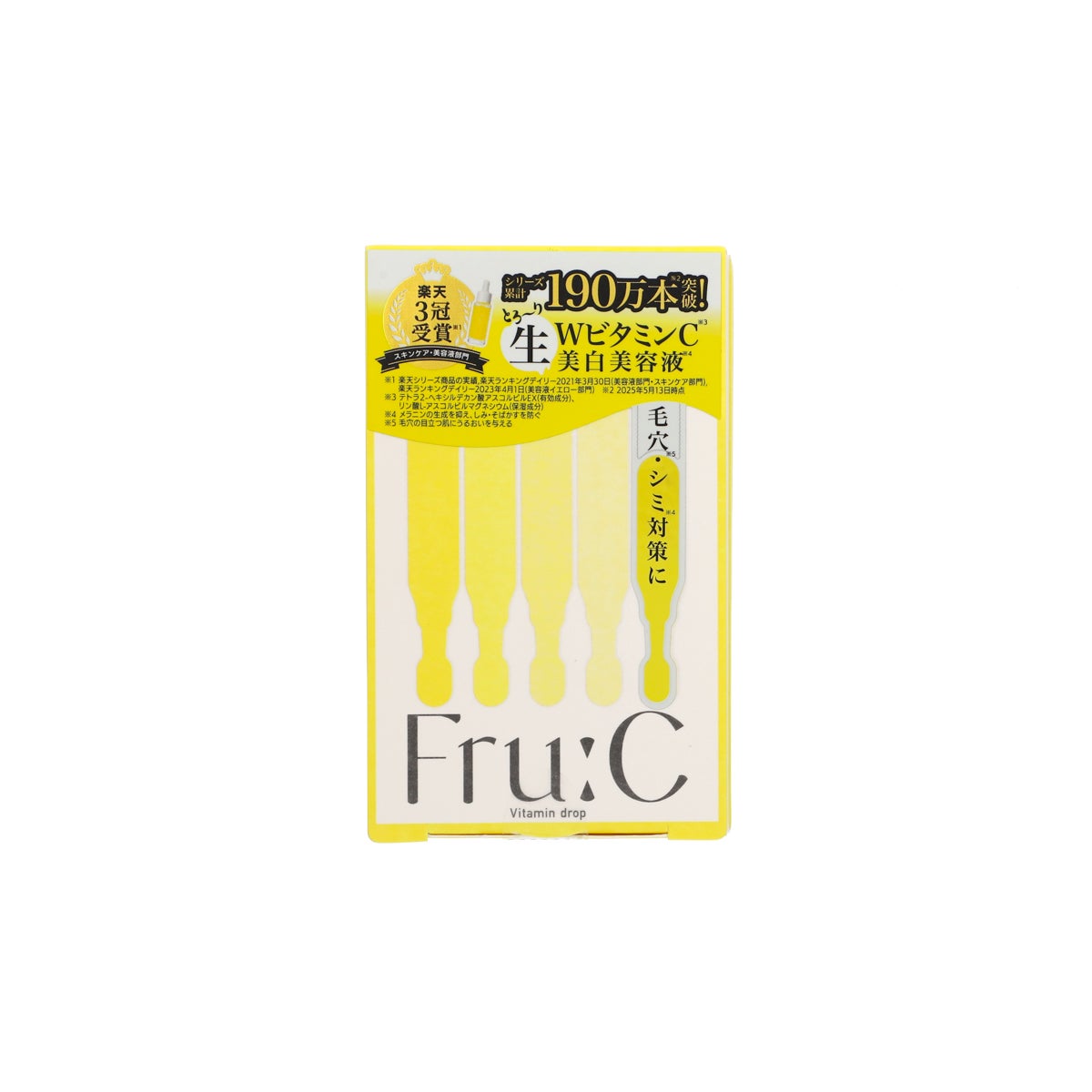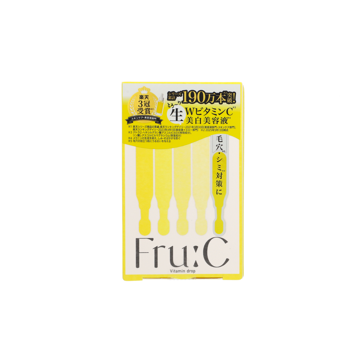 Fru:Cビタミンドロップは、水溶性ビタミンC誘導体と油溶性ビタミンC誘導体をWで配合!美白有効成分***がメラニンの生成を抑え、シミ・ソバカスを防ぎます。