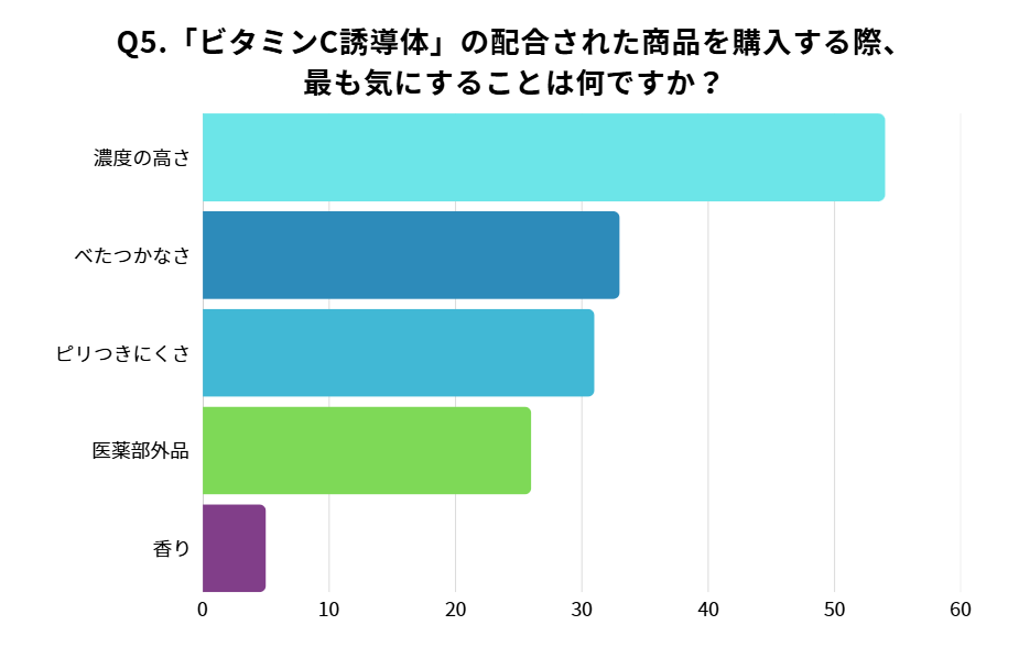 ビタミンCは濃度が高いほど効果実感も感じやすいですが、調査結果にもあるようにべたつきやピリつきが比例して感じやすくなってしまいます。美白志向が高まる今だからこそ、効果実感と使いやすさが両立した商品が求められているのかもしれません。