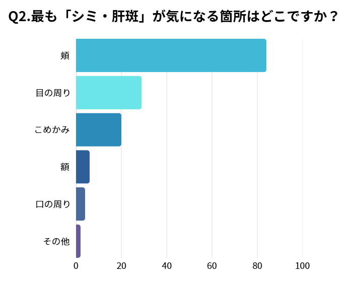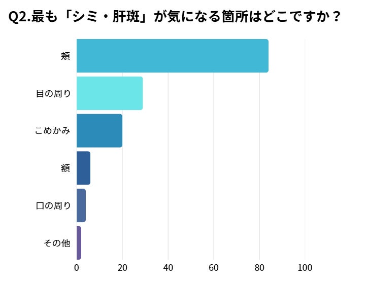 さらに、最も「シミ・肝斑」が気になる箇所を聞いたところ、「頬」の回答が1位となりました。頬は日中紫外線が当たりやすく、さらにお顔の中心で目立つこともあり多くの方が気にされていることが分かります。