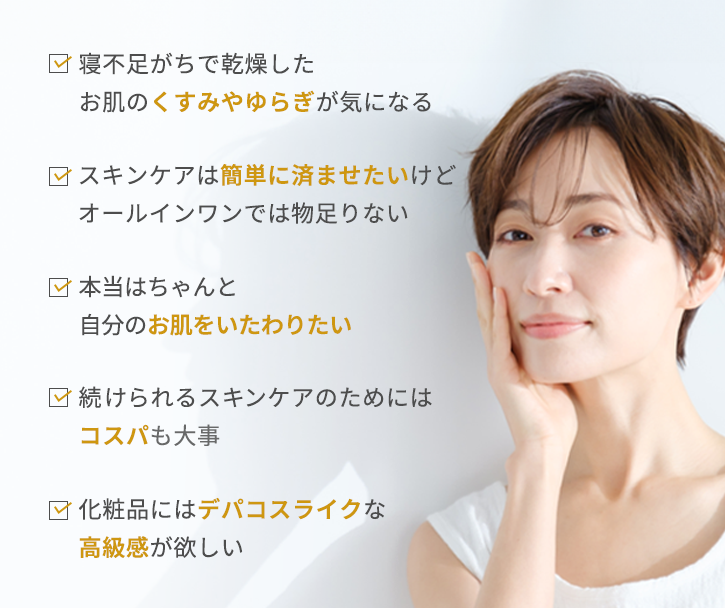 そこで考案したのが「寝不足が原因で起こる乾燥くすみ対策」と「肌荒れ防止」を訴求成分の中心に据えて、「ほぐす 満たす 整える」の3つのアプローチで効果を最大限に高め、「ゆるぎないツヤ肌」を目指す、2ステップ、3つのスキンケアラインです。