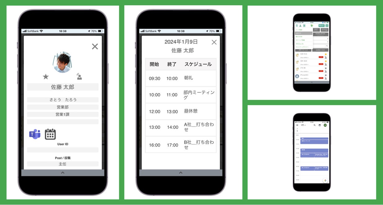 「Beacapp Here」ユーザー画面のメニューバーにある「スケジュール」から自身のスケジュールを確認することができます。また、他ユーザーのアイコンをタップすると表示されるユーザー詳細画面にあるカレンダーアイコンをタップすることで、他のユーザーのスケジュールも参照することが可能です。さらに、ホテリング機能を活用してオフィスのスペースを予約した際は、その情報が自身のスケジュールシステム上でも確認できるようになります。