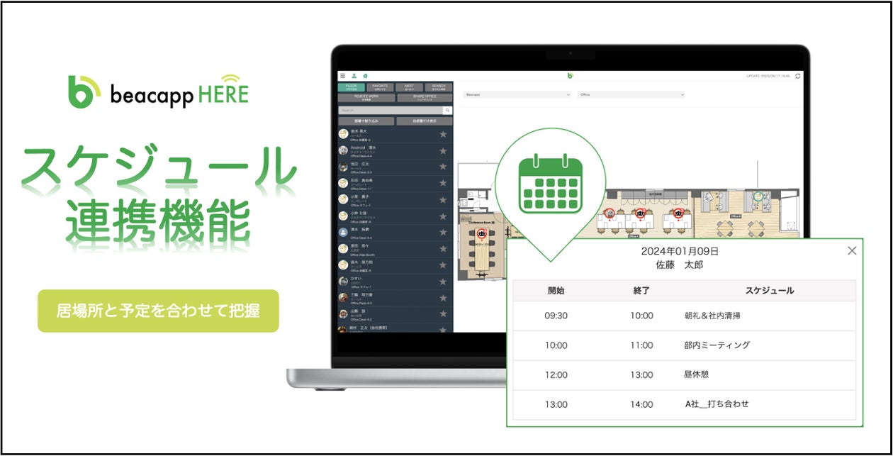 屋内位置情報サービス累計導入社数No.1※1の「Beacapp Here」を提供する株式会社ビーキャップ(東京都中央区、代表取締役社長 岡村 正太、以下「ビーキャップ」)は、「Beacapp Here」とOutlook予定表、Googleカレンダーの連携が可能となり、シームレスに従業員の予定が確認できるスケジュール連携機能をリリースしたことをお知らせいたします。