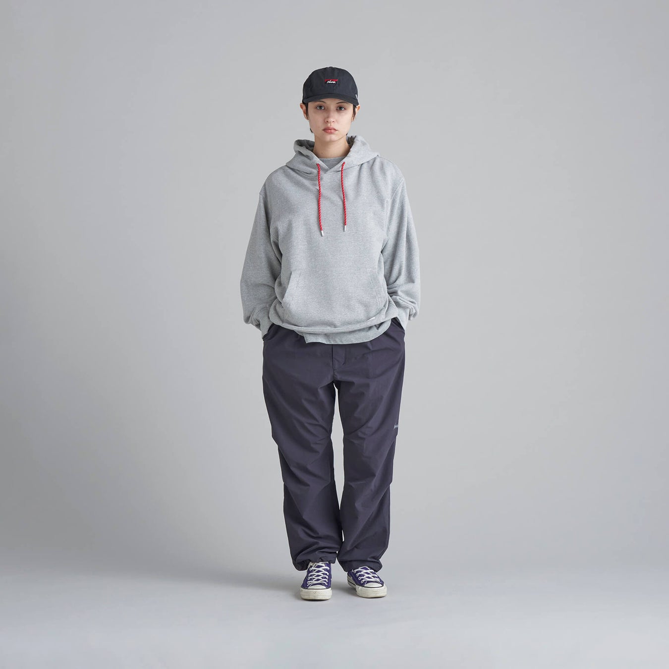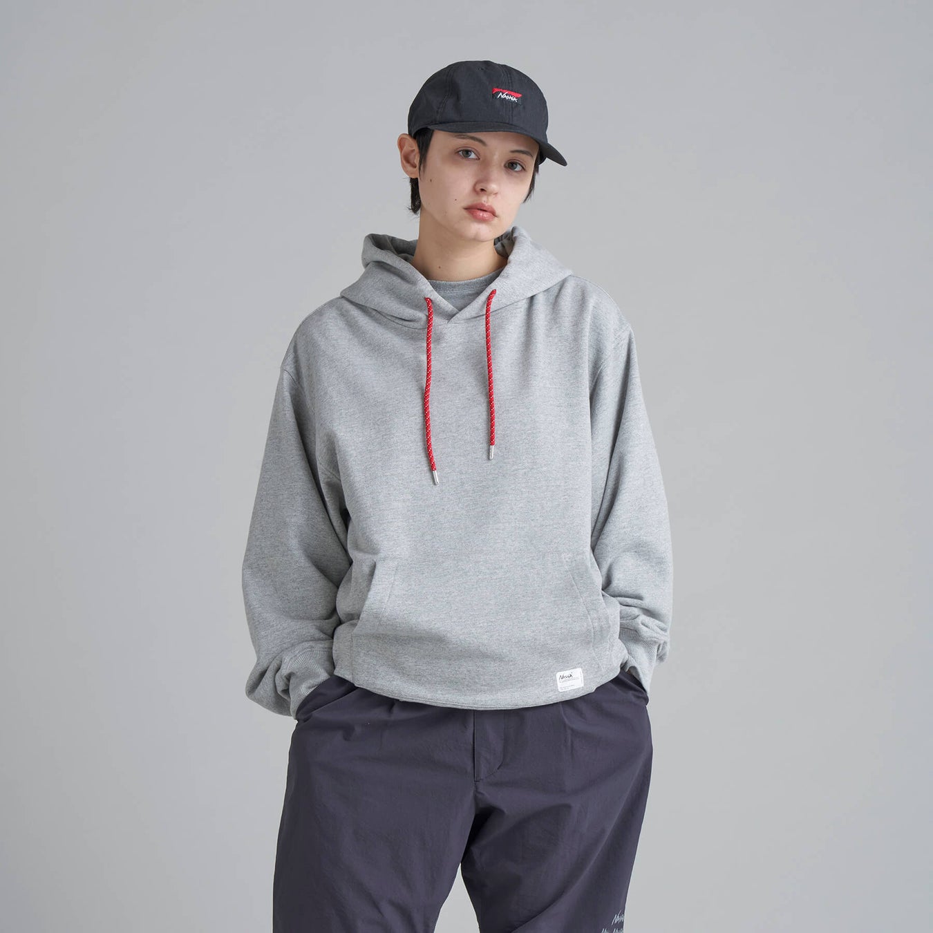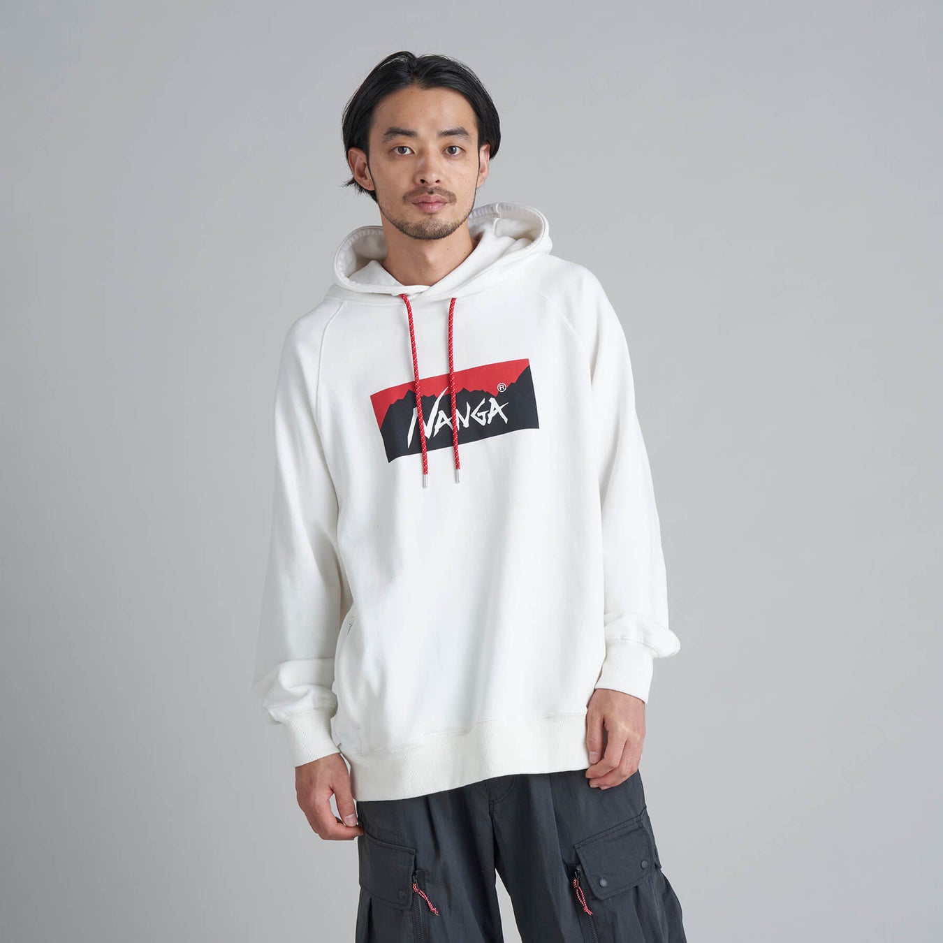 スポーティな印象のラグランフーディー。カンパニーロゴの赤とマッチしたネックのスピンドルは、NANGA オリジナルのミックスカラーコード。