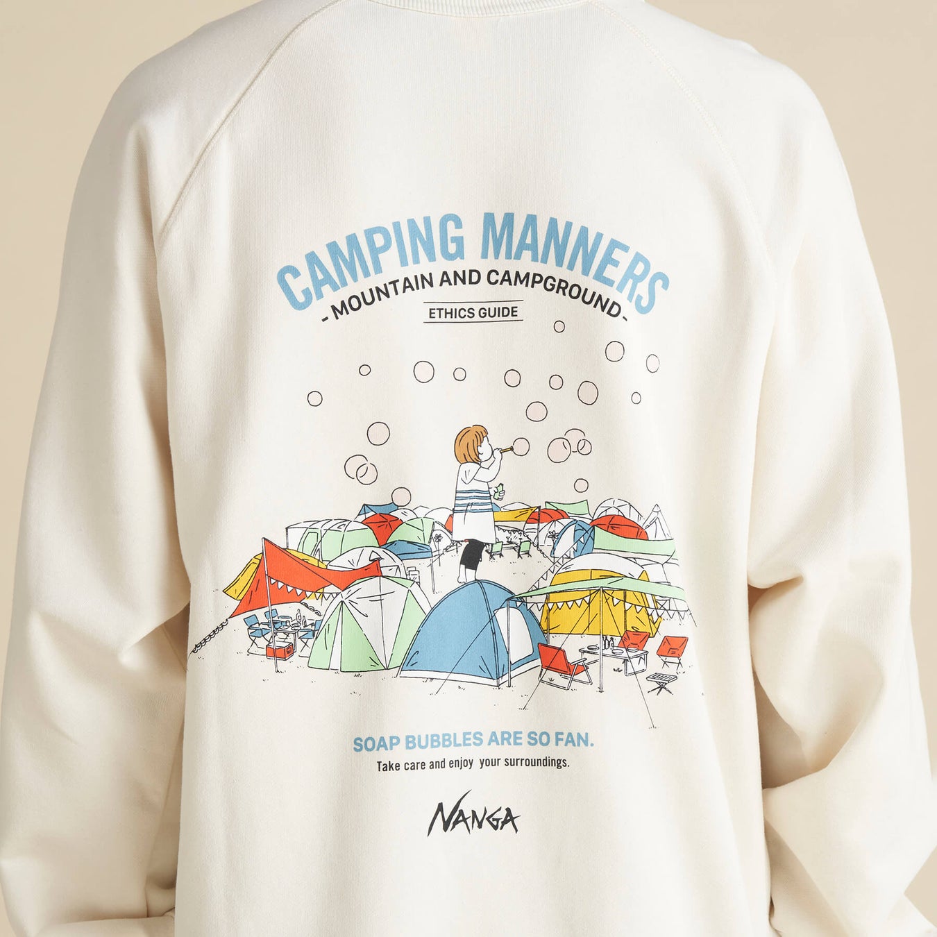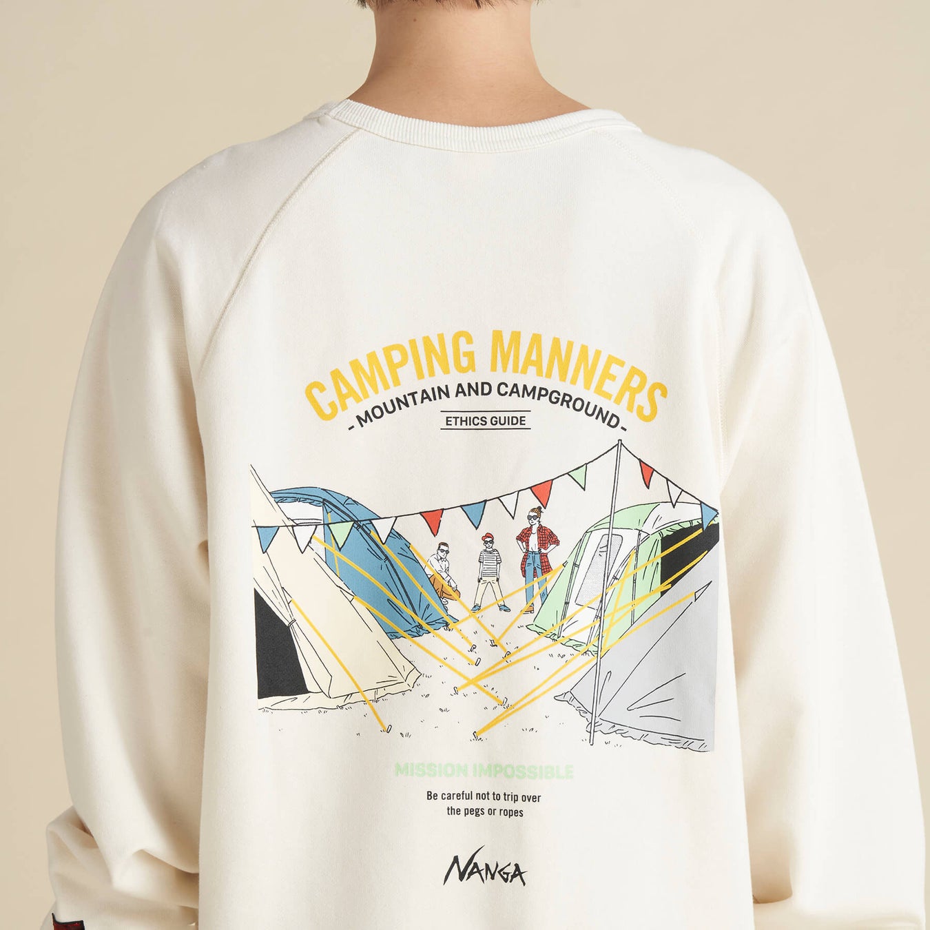 NANGA からのメッセージをプリントした、キャンピングマナーシリーズのスウェット