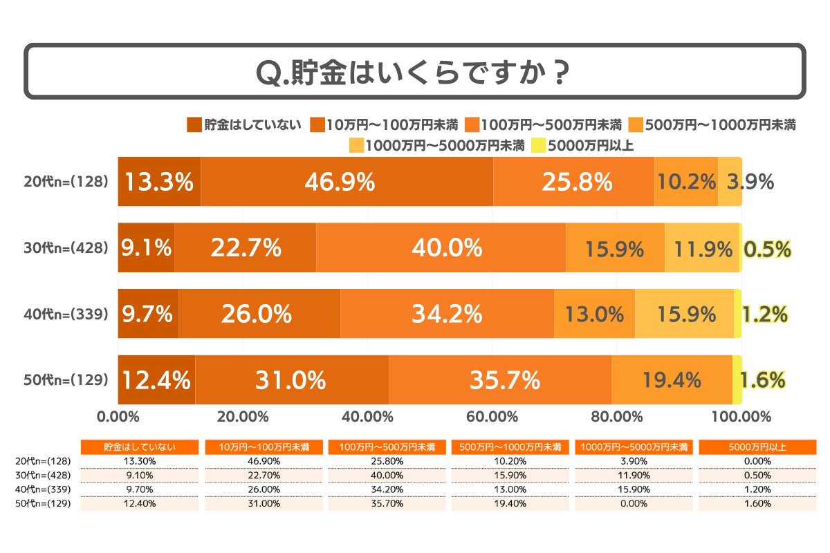 貯金額について尋ねたところ、「10万円未満」が9.2%、「10万円〜100万円未満」が24.9%と、100万円未満の人が34.1%にのぼりました。