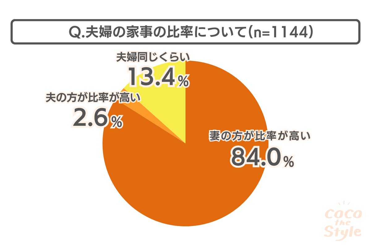 夫婦の家事負担について尋ねたところ、「妻の方が比率が高い」と答えた人は84.0%にのぼりました。