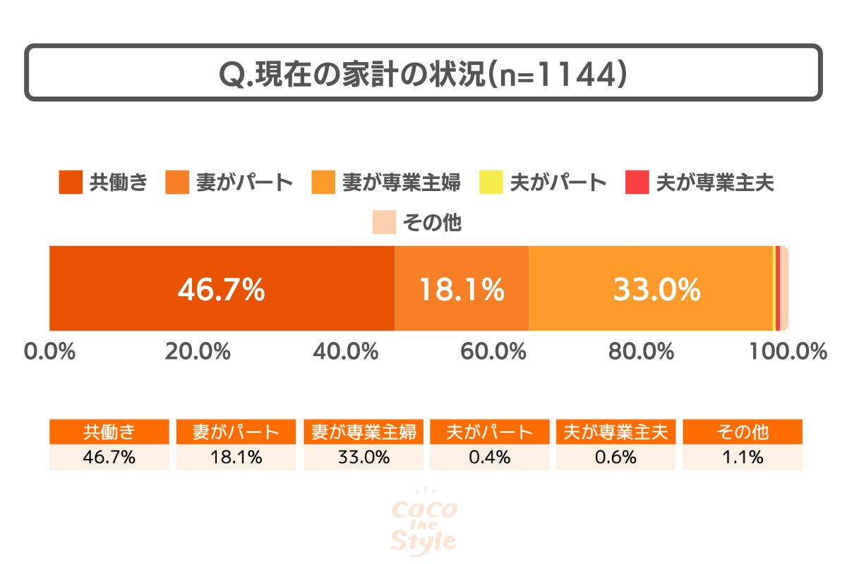 さらに、共働きの家庭は46.7%と約半数でした。一方で、「妻が専業主婦」33.0%、「妻がパート」18.1%と、半数以上の家庭で妻がフルタイムでは働いていないことが分かりました。