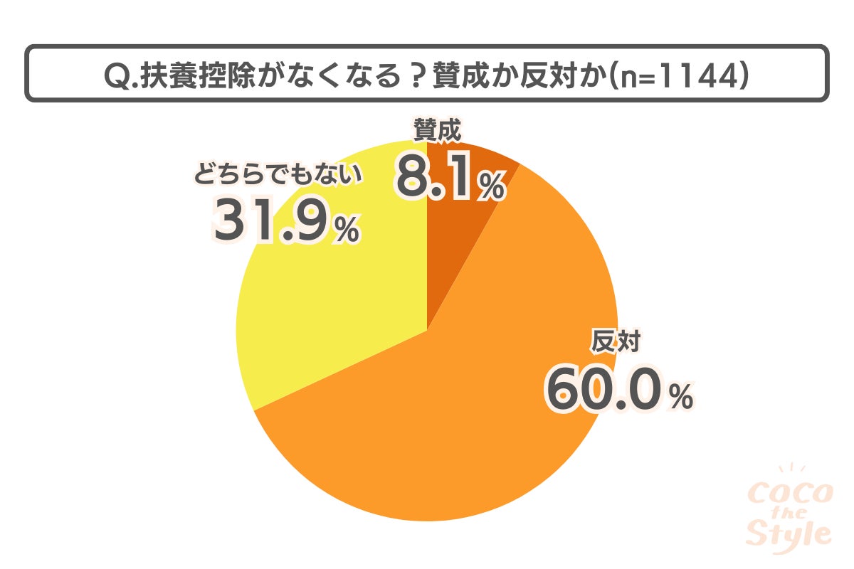 扶養控除が廃止になる可能性についての意見を尋ねたところ、「反対」と答えた人は60.0%と多数を占めました。「どちらでもない」と答えた人は31.9%、「賛成」はわずか8.1%にとどまりました。