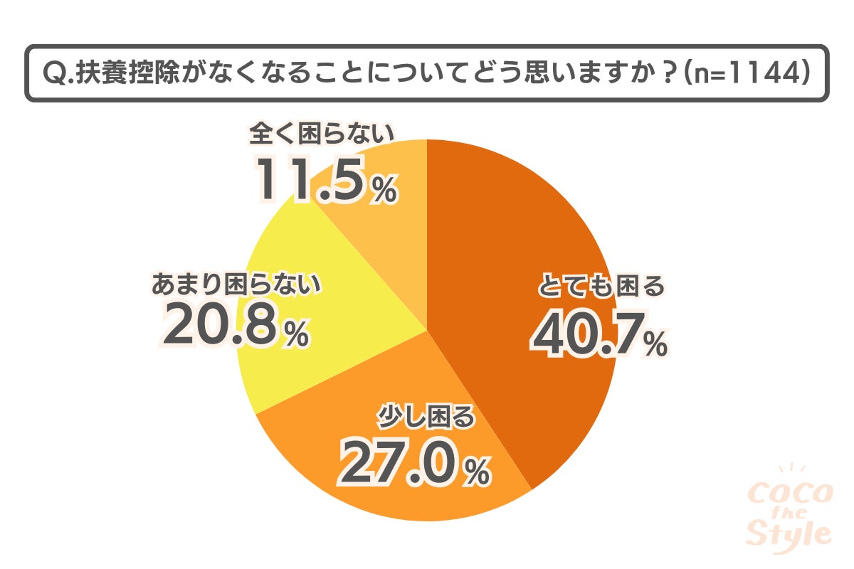 また、「扶養控除がなくなることについてどう思うか」という質問に対し、「とても困る」40.7%、「少し困る」27.0%を合わせると、67.7%が影響を受けると回答しました。一方、「あまり困らない」20.8%、「全く困らない」11.5%と、影響を受けないとする意見もありました。