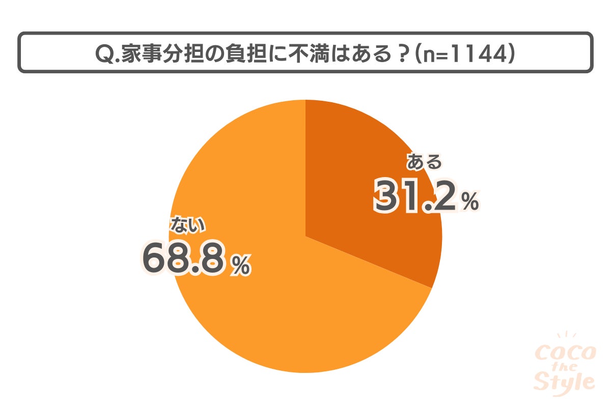 家事の負担について不満があると回答した人は31.2%でした。ないと答えた人は70%程度と、夫婦でうまく家事を分担できている家庭が多いようです。