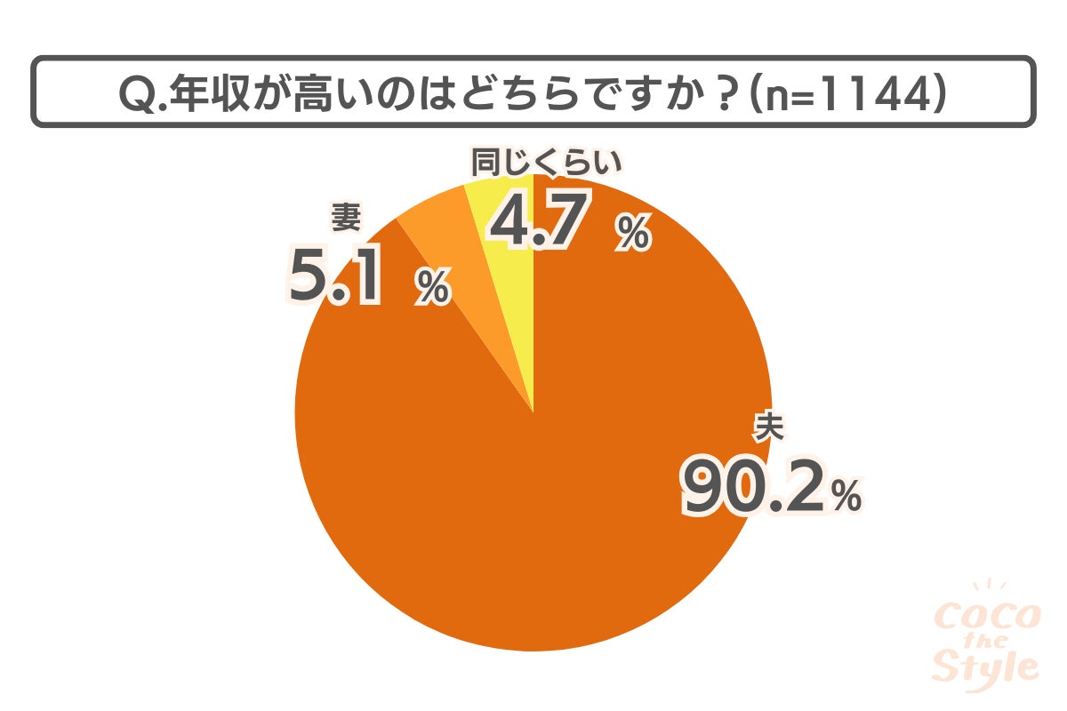 今回の調査では、90.2%の家庭で夫の年収が妻よりも高いと回答。「同じくらい」と答えた人は4.7%、「妻の方が高い」と答えた人は5.1%にとどまりました。