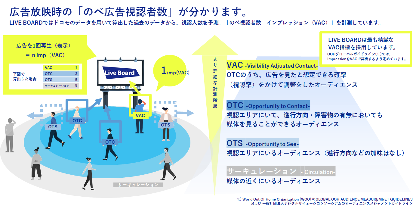 LIVE BOARDは、OOHグローバルメジャメントガイドラインにて推奨されている、視認調査に基づく視認率を加味したインプレッション(VAC=Visibility Adjusted Contact / のべ広告視認者数)を採用しています。媒体の視認エリアの中にいる人数(OTS=Opportunity to See)のうち、OOH広告に接触する可能性のあるのべ人数(OTC=Opportunity to Contact / 視認エリア内での移動方向や障害物の有無を考慮)を定義。この数に媒体に応じた視認率を加味することで、実際に広告を見るであろうのべ人数(VAC)を推計しています。