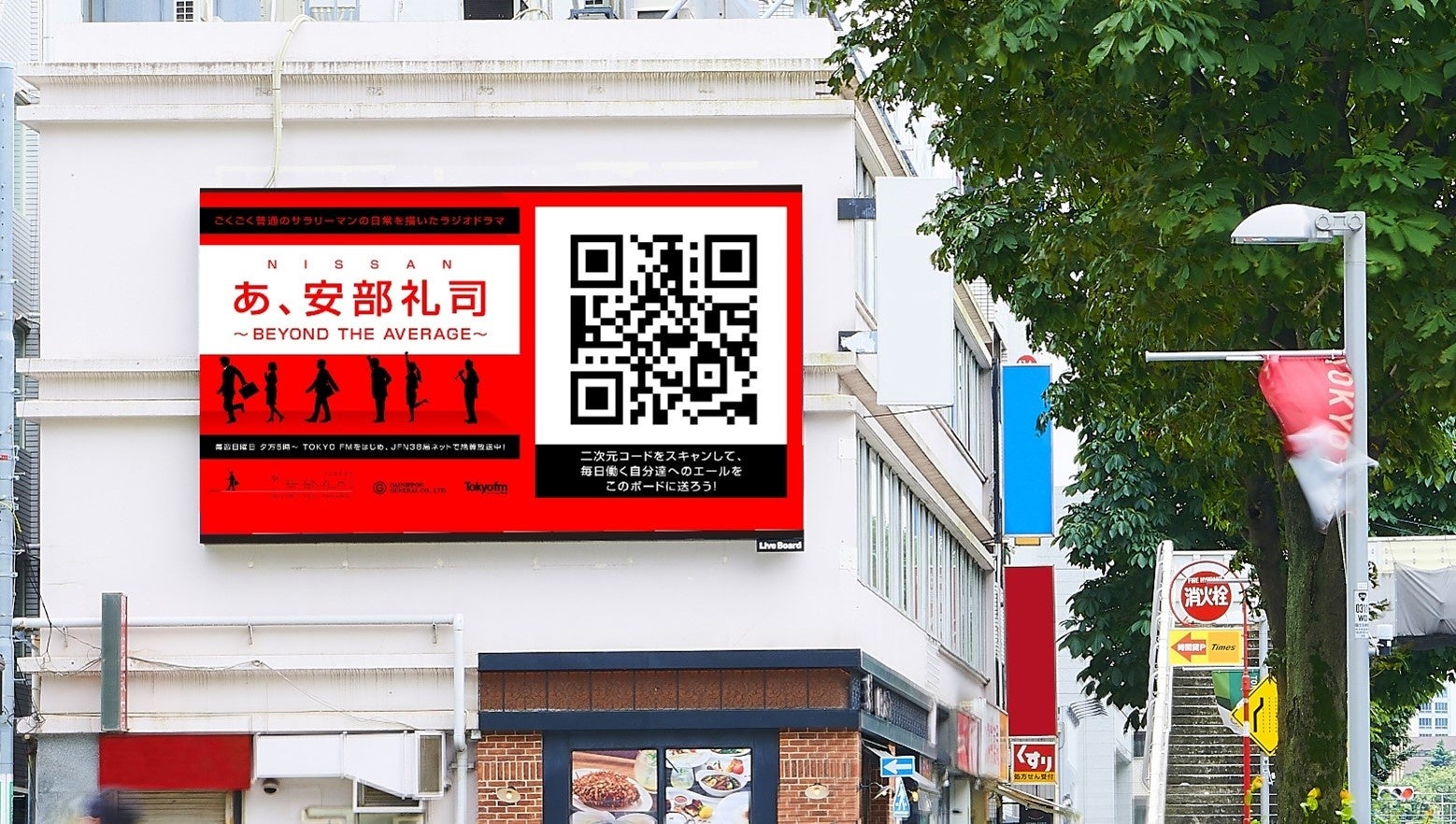 株式会社 LIVE BOARD(本社:東京都渋谷区 代表取締役社長 櫻井 順 以下、LIVE BOARD)は、TOKYO FM(株式会社エフエム東京)とJFN(ジャパンエフエムネットワーク)各局で放送中のラジオドラマ「NISSAN あ、安部礼司 ~ BEYOND THE AVERAGE ~」(提供:日産自動車株式会社 以下、日産自動車)とコラボレーションし、全国に設置されたLIVE BOARDの屋外ビジョン11カ所(北海道、東京、愛知、大阪、福岡エリア)を活用し、最先端のプログラマティックOOH※1技術を生かしたインタラクティブ配信※2キャンペーンを2023年12月11日(月)~17日(日)の期間限定にて実施します。